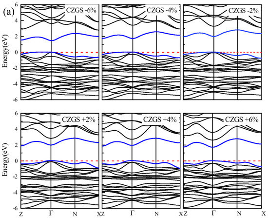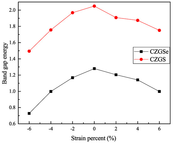 By the application of strain on the structure, the gap value is completely modified; the band structure of both CZGS and CZGSe with different rates of applied strain is presented in Figure 4. The percentage range of the biaxial strain was chosen as between −6% and +6% by step of 2%, where the 0% represents the equilibrium states, as shown in Figure 3 and the negative (positive) represents compressive (tensile) strain. In all cases, no changes were observed on the nature of the band gap; whatever the intensity of the applied strain, the materials always present a direct band gap at Gamma point. However, the difference appears on the energy band gap value in comparison to the equilibrium state. To highlight this difference, we propose to illustrate, in Figure 5, the variation in the band gap energy versus the biaxial strain. As we can see, the bandgap energy is more sensitive to compressive strain than the tensile one. This is due to the strong interaction between atoms, due to the shrinkage of the lattice parameter in the case of compressive strain. The gap value varied from 2.05 to 1.495 eV and from 1.28 to 0.728 eV for CZGS and CZGSe, respectively, while the bandgap under tensile decreased to 1.751 and 0.998 for CZGS and CZGSe, respectively.