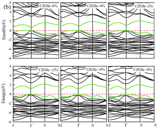 Variation of band structure with lattice parameter deformation (a) for CZGS and (b) for CZGSe.