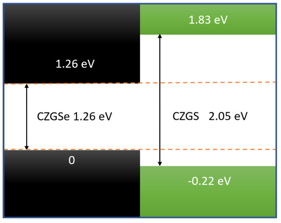 This band dicontuinity of CZGS and CZGSe is presented in Figure 7. As we can see, the bandgap of CZGSe is completely contained in CZGS bandgap, which makes the alignment between both materials a straddling type (type I), with a valence and conduction band offset of 0.22 and 0.77 eV, respectively. The band offset of CZGS/Se is larger than the reported bands’ offset of the well-studied kesterite CuZnSnS/Se 0.35 and 0.15 eV [45], which is a result of the substitution of Sn by Ge, resulting in an increased bandgap of kesterite material. The minimum of the conduction band is the antibonding state s of Ge, while the maximum of the valence band is the bonding d of Cu.