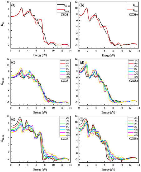 The variation of the real part of the dielectric function spectra as a function of the incident photon energy for both materials CZGS and CZGSe: (a,b) are the unstrained cases, (c–f) are the strained cases. and are the real parts of the dielectric function for light polarization along XX and ZZ respectively.