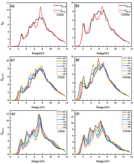 The variation of the imaginary part of the dielectric function spectra as a function of the incident photon energy for both materials CZGS and CZGSe: (a,b) are the unstrained cases, (c–f) are the strained cases. and are the imaginary parts of the dielectric function for light polarization along XX and ZZ directions respectively.