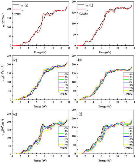The variation of the absorption coefficient spectra as a function of the incident photon energy for both materials CZGS and CZGSe: (a,b) are the unstrained cases, (c–f) are the strained cases. and are the absorption coefficients for light polarization along XX and ZZ directions respectively.