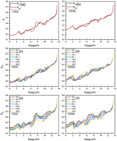 The variation of the reflectivity spectra as a function of the incident photon energy for both materials CZGS and CZGSe: (a,b) are the unstrained cases, (c–f) are the strained cases. and are the reflectivities for light polarization along XX and ZZ directions respectively.