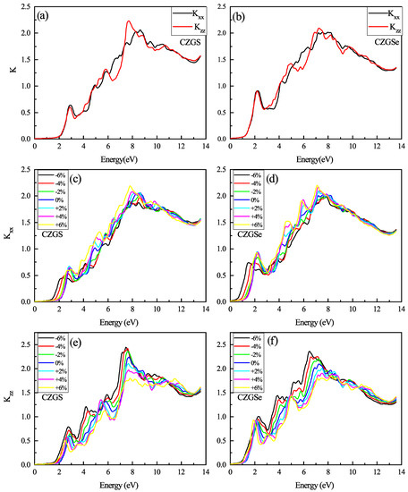 The variation of the extinction coefficient spectra as a function of the incident photon energy for both materials CZGS and CZGSe: (a,b) are the unstrained cases, (c–f) are the strained cases. and are the extinction coefficient for light polarization along XX and ZZ directions respectively.