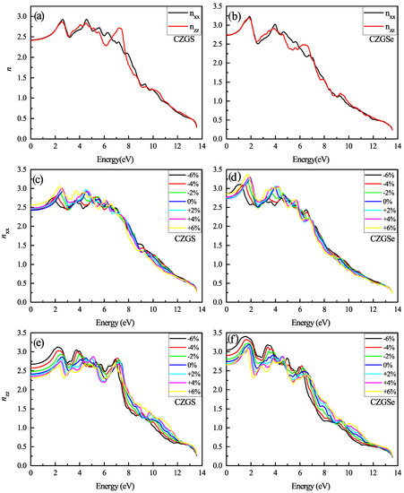 The variation of the refraction index spectra as a function of the incident photon energy for both materials CZGS and CZGSe: (a,b) are the unstrained cases, (c–f) are the strained cases. and are the refraction index for light polarization along XX and ZZ directions respectively.