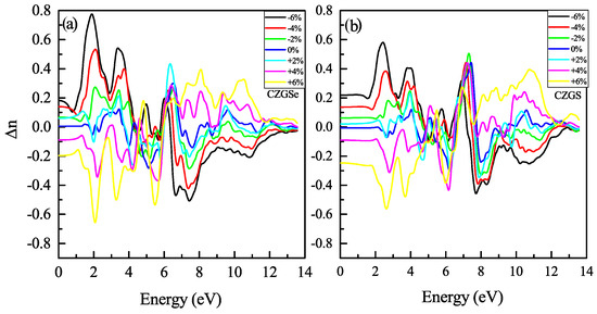 The refraction index is plotted in Figure 14a,b. The static refraction index for CZGS and CZGSe is 4.7 and 4.6, respectively. The refraction index increases to it maximum value near 2 eV for both materials. The strain induces the high anisotropy of the optical properties. After straining CZGS/Se, double refraction is observed, which leads to birefringence behavior in the materials. We present, in Figure 15, the spectral behavior of the birefringence for the Kesterite CZGS/Se with different strain percentages. It is important to quantify the maximum difference between refractive indices exhibited by the material. Generally, birefringence is defined as the difference between the extraordinary and ordinary refraction indices, , where n and n are the extraordinary and ordinary refraction indices [49], for the kesterite materials, which, respectively, represent the parallel and perpendicular refraction index of CZGS/Se. It is well known that the material has a positive uniaxial birefringence if its birefringence is positive, and it is said that the materials with a negative have negative uniaxial birefringence. As can be seen from Figure 15, the birefringence is found to be more remarkable in two significant regions. The first region corresponds to the range of energy from which the absorption coefficient is an increasing function. The birefringence is positive for the compressive strain and negative for the tensile one for both materials. The second region represents the region of high energies, in which the absorption stagnated (see Figure 10), where the birefringence behaviour was reversed. We note that CZGSe presents a higher birefringence behaviour than CZGS. These changes in the optical properties are mainly due to the break of symmetry induced by straining the structure.