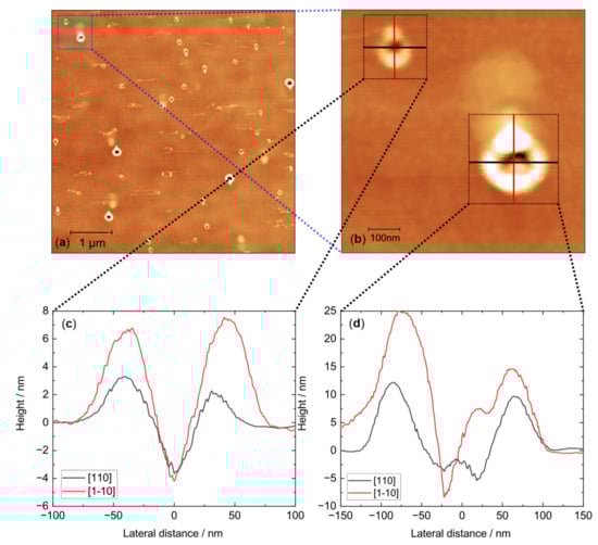 In Figure 3b, a representative detailed image of the two modes is presented. Representative height profiles are plotted in Figure 3c for the shallow hole mode with a depth of approximately 4–5 nm and in Figure 3d for the deep hole mode with a depth of approximately 9–13 nm (ensemble range). The deep holes show strong asymmetry with an almost squared shape. The shallow holes appear round with a slight asymmetry depending on the crystal orientation. It is noted that the shallow holes show a wide relative size distribution with very small and slightly larger holes, which can be seen in Figure 3a.