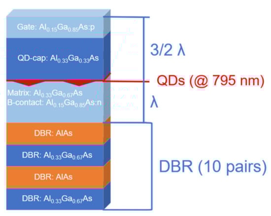 Sample growth is exemplified in the structure used by Zhai et al. [1]. In the discussion, this sample is referred to as the “photonic sample”. Layer growth was performed under an As-BEP of 9.6 × 10−6 Torr and at 620 °C. On the deoxidized substrate, a 100 nm GaAs buffer layer was grown in 10 nm steps with intermediate annealing breaks. On top, 22 layer pairs of a 2.8/2.8 nm GaAs/AlAs short-period superlattice (SPS) were deposited. This was followed by 10 pairs of an Al0.33Ga0.67As/AlAs distributed Bragg reflector (DBR), designed for a 795 nm reflection maximum (stopband-center) at 4 K.