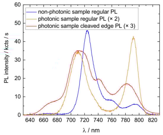 Comparison of regular ensemble PL emission of the photonic sample (orange line), non-photonic sample (blue line), and cleaved-edge PL of the photonic sample (red line). For better comparability, multiple factors were used.