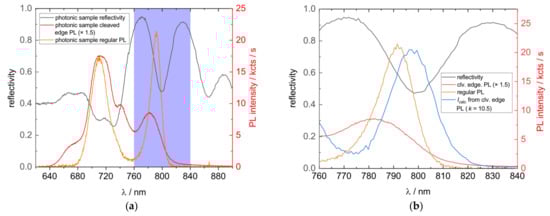 The undistorted cleaved-edge intensity is multiplied by one minus the measured reflectivity to account for the wavelength-dependent PL distortion of the cavity. The empirical factor accounts for an intensity enhancement through the cavity and standing wave field as well as the different measurement conditions. In Figure 6b, the model is applied and plotted (blue line). It reshapes the PL peak measured by regular PL quite well, but a redshift from 791 nm to 797 nm is still visible as well as a slightly broader peak. The reason for this could be the spectral resolution of the reflectometer and the reflectance spectrum being measured at room temperature while PL was performed at 100 K. Simulations show that the cavity-induced stop-band dip is shifted by 6–8 nm upon cooling the sample from 300 to 100 K, which fits well with the observed difference. A reflectivity measurement at 100 K is expected to enhance the agreement but was not technically possible.