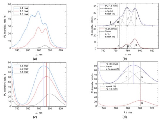 Table A2 shows the parameters that were obtained by fitting several macro-PL spectra. The fits are used to illustrate the visible spectral change in Section 3.2 Figure 7. Values marked with * were constrained for physical consistency (approximately equidistant level-splitting, FWHM in plausible range), otherwise the fits would diverge. S- and P-states were unconstrained for all fits, except for Figure 7d (4.5 mW), where the position was fixed to the fit-value from the low power measurement.