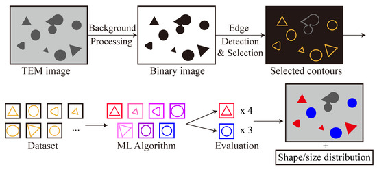 The schematic diagram of our ML method workflow is shown in Figure 1. The method is divided into two parts: The first part is pre-processing, which converts the raw image data into nanoparticle contour datasets that are then applied to the ML algorithm. The second part is the application of the ML algorithm to classify the shapes and the evaluation of the ML output to obtain the relevant information, in this case, the shape distribution.