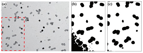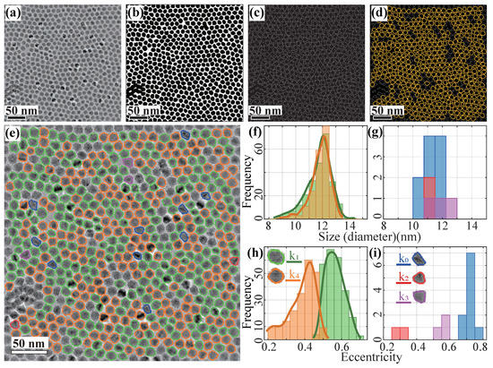 As seen from the original BF-TEM image in Figure 5a, the QDs have a very high packing density, filling nearly the entire image where the background only occupies a very small proportion of the image. In addition, the QD contrast is relatively low compared to the background. Such complex background condition presents a challenge for background removal. Moreover, most of the particles have non-distinct shapes, making manual classification of the shape nearly impossible. Therefore, this case is deliberately selected and served to test the reliability of our method for images with low contrast, low background area and irregular particle shapes.