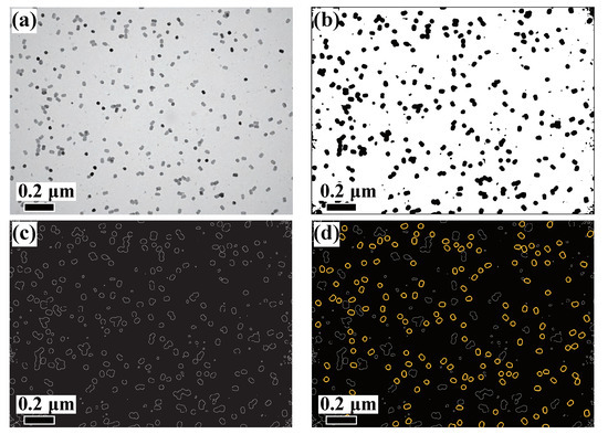 After removing the background and converting the images into binary form, the particle’s edges (shapes) are identified by applying the Canny Edge Detection algorithm [43]. This algorithm is based on the first-order derivative of the noise-reduced, smoothed image in the X, Y directions, and the edges of the particles are located at the pixels with maximum values of the first-order derivative along the gradient directions. This is a widely used method due to its simplicity and robustness [44,45].