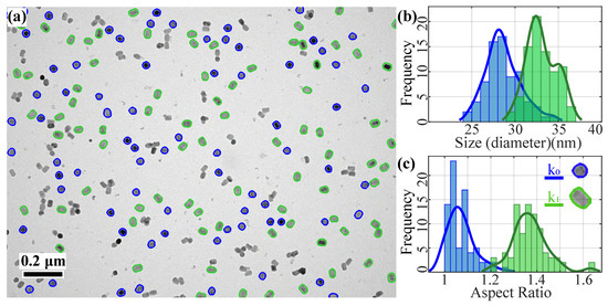 Figure 3b–d shows the successful processing by our pre-processing method, where 156 isolated particle shape contours were extracted. The optimal number of clusters, k, is determined to be two by the CVIs. The classified particles overlaid with the original TEM image are shown in Figure 4a. It can be seen that one particle shape cluster, k (blue), is polygonal (hexagons and pentagons) and the other cluster, k (green), is rod-shaped. The particle size distribution and the aspect ratio distribution for each cluster are plotted in Figure 4b,c, respectively. The two shape clusters are clearly separated in the aspect ratio distribution plot, with the polygon cluster, k, having a mean value close to 1 and a higher value of about 1.4 for k. In addition, the particles in the k cluster mostly have a smaller size with a mean diameter around 34 nm whereas those in the k cluster have a slightly larger mean diameter around 38 nm. Table 1 provides a summary of the statistics for the UNCP size and shape analysis.