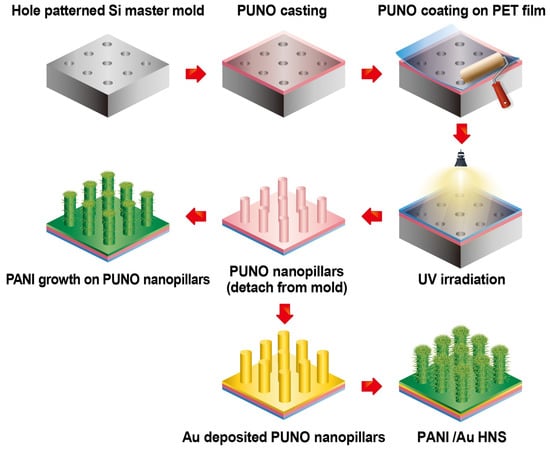 To obtain highly ordered NPAs, a polymer blend of PUA and NOA63 was spin-coated onto a prefabricated silicon mold, followed by UV curing and removal by peeling from the mold (Figure S1) []. The NPAs have a diameter, height, and center-to-center distance of 500 nm, 1.25 μm, and 1 μm, respectively; these dimensions are easily replicated and produced using a single silicon wafer mold (8-inch diameter). The schematic of the fabrication procedure of the PANI/Au hierarchical nanostructure (HNS) is shown in Figure 1. The highly nanopillar arrayed polymer film was initially fabricated by a combination of photo- and soft lithography. In addition, 20 nm thick titanium (Ti) and 200 nm thick gold (Au) layers were deposited on the surface of the NPA film to extend the growth of PANI. To synthesize a unique 3D hierarchical structure based on NPAs, the dilute polymerization method enabled the degree of PANI nanostructure growth to be controlled [,,]. In general, chemical polymerization for PANI synthesis occurs when a pH of 3 or less and strong oxidants are applied; the lower the pH, the lower is the probability of the formation of a branched polymer structure [,,]. Based on these mechanisms, the effects of controlling reaction time, molar concentration of monomer, molar concentration of oxidant, and acidity are determined by the morphology of the PANI.