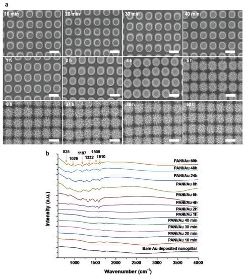 To investigate and understand PANI nanofiber construction on NPAs, the morphological and chemical structural changes were observed via scanning electron microscopy (SEM) and Fourier-transform infrared (FTIR) spectroscopy. Figure 2a shows the SEM images of the PANI nanofibers on Au-deposited NPAs. The reaction was performed under different reaction times, ranging from 10 min to 60 h, using 0.01, 0.0067, and 1 M of aniline, ammonium persulfate, and perchloric acid, respectively. During the reaction time from 10 min to 1 h, no significant morphological changes were observed in the SEM images. Interestingly, after 2 h of PANI growth, numerous small dots slowly appeared on the NPA surface. In addition, the SEM images (Figure 2a) show the formation of a PANI nanofiber bridge at 4 h and the gradual growth of spike-shaped PANI fibers after 6 h of reaction. Moreover, the highly dense PANI nanofibers and networks were successfully constructed around the NPA after 8 h of reaction, but almost no significant morphological changes were observed even after increasing the reaction time to 60 h. Moreover, the nanofibers have different diameters and lengths, ranging from 50 to 80 nm and from 150 to 250 nm, respectively. Notably, the PANI nanofiber grew after 6 h of reaction time and was connected to the PANI nanofiber grown in the adjacent NPAs, resulting in a network structure. The area of these network structures gradually increased and formed a PANI/Au HNS.