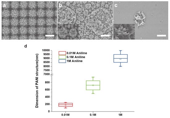 The monomer concentration is another important parameter affecting the PANI morphology. To understand the effect of monomer concentration, PANI was synthesized under different molar concentrations of aniline: 0.01, 0.1, and 1 M. At a concentration of 0.01 M, PANI was fully covered and formed a nanofiber network on the NPA surface as observed in the SEM image (Figure 3a). At 0.1 M, PANI grew rapidly in the reactant to form numerous micrometer-scale clusters on the NPA but no PANI nanofibers and/or nanonetworks were fabricated (Figure 3b). As the molar concentration of aniline increased to 1 M, macroscale flower-like structures grew on the NPA (Figure 3b,c). The relatively low molar concentration of aniline resulted in more acidic conditions and easily formed numerous seeds. These seeds were immobilized on the surface of the gold to construct fibrous structures on the NPA surface. In contrast, as the molar concentration of aniline increased, the solution became more alkaline and fewer seeds were produced. In addition, the slow chemical polymerization of PANI produced microscale clusters and/or flower-like structures on the NPA surface [,,,,].