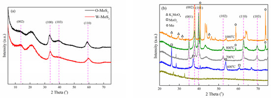 XRD measurement was employed to analyze the crystalline structure of the catalysts, with the patterns displayed in Figure 2. Based on the PDF#74-0932 card, the identified diffraction peaks for O-MoS2 and W-MoS2 can be indexed to the hexagonal 2H-MoS2 phase [42]. The weak intensity of peaks at 32.7° and 58.3°, corresponding to the (100) and (110) in-plane diffraction, indicates poor crystallinity and the small crystalline domains of MoS2. Furthermore, the (002) peak representative of the number of stacked layers was weaker in O-MoS2 than that in W-MoS2, indicating that as-synthesized O-MoS2 showed no evident stacking of the MoS2 monolayers along the c-axis while W-MoS2 could be of a multiplayer nature. Based on the Scherrer equation, the mean sizes of W-MoS2 and O-MoS2 were tentatively calculated to be 4.1 and 4.4 nm, respectively.