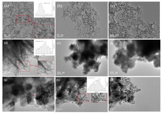 The crystal structure of the samples was characterized by using XRD system (X‘Pert Pro MPD) equipped with a Cu-Kα irradiation source in the 2θ range of 5–75° with a scanning speed of 5°·min−1. The morphologies of samples were measured by TEM (JEM-2100UHR, Japan Electronics Co., Ltd., Tokyo, Japan) at 5 kV accelerated voltage. XPS analysis was performed on a K-alpha 250Xi spectrometer (Thermo Fisher Scientific, Waltham, MA, USA) with an Ar ion source at 0.5–1.5 KeV. BET specific surface areas and BJH pore size distribution of catalysts were determined based on the nitrogen physisorption measurement using ASAP 2020M/Micromeritics instrument (Micromeritics Instrument Co., Norcross, GA, USA). During nitrogen physisorption measurement, the wet MoS2 samples with ethanol were degassed at 150 °C under vacuum for 10 h before analysis.