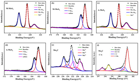 High-resolution XPS spectra of the Mo 3d (a,c), S 2p (b,d) regions of O-MoS2 and W-MoS2 respectively, and the Mo 3d (e), C 1s (f) regions of Mo2C.