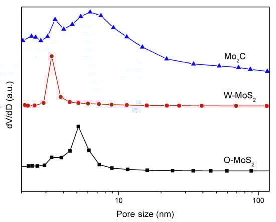 The BET surface areas of the W-MoS2, O-MoS2 and Mo2C were determined to be 51.6, 324.6 and 42 m2/g, respectively. The extremely high surface area of O-MoS2 was much greater than that of W-MoS2 and could be one of the possible reasons for its higher catalytic activity. Even though Mo2C presented a lower surface area than MoS2, it could still display excellent catalytic activity because of its Pt-like nature. The BJH pore size distribution curves of MoS2 and Mo2C are presented in Figure 5. The pore-size distributions revealed that the W-MoS2 and O-MoS2 had only a narrow peak at around 3.2 nm and 9 nm, respectively. Conversely, the Mo2C catalyst showed a narrow pore-size distribution peak at approximately 3.4 nm, and another larger pore distribution broader than 5 nm. Since larger mesopores are much more important for mass transfer resistance for reacting molecules, such a combination on the hierarchical structures is potentially ideal for the catalytic reaction. The hierarchical structures prevent the entry of polycyclic aromatic hydrocarbons, but allow the entry of olefinic substituents. This special pore size distribution could be beneficial for improving the selectivity in the hydrogenation reaction.