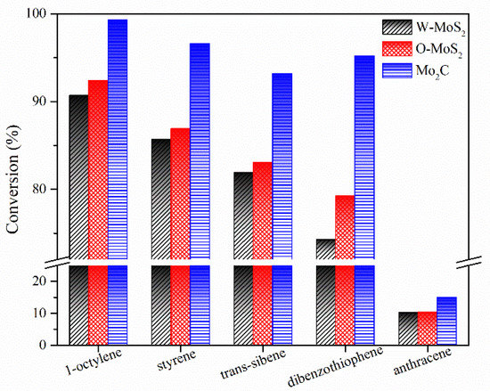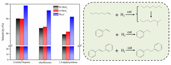 The hydrogenation treatments of the slurry oil surrogate were carried out at 380 °C with MoS2 and Mo2C nanoparticles. The typical GC-MS results of the products are shown in Figure S1 as supporting information. It can be seen that 1-methylnaphthalene was simultaneously hydrogenated and thermally cracked during the hydrotreating process, and the chromatographic peaks of these derived products were relatively extensive because of the extremely high amount of 1-methylnaphthalene. However, it did not affect the following discussion about the catalytic activity of Mo-based catalysts for the hydrogenation of olefins and sulfur compounds in the present work. The conversions for each molecule contained in the slurry oil surrogate are shown in Figure 6. Over 80% of the olefins were removed by hydrotreatment with the three Mo-based nanoparticles. The conjugated olefins are more difficult to hydrogenate than monoolefins due to the higher aromaticity and larger steric hindrance [7]. Because of the good dispersion and smaller particles, proved by HRTEM, the O-MoS2 exhibited better activity for olefin removal than W-MoS2, although the amount of W-MoS2 was greater [24]. Further enhanced catalytic activity was found for Mo2C, even trans-stilbene had an increased conversion of 92%. The selectivity for hydrogenated products during olefin hydrotreatment is illustrated in Figure 7. It demonstrates that the excellent catalytic performance of Mo2C for olefin removal mainly originates from its activity for hydrogenation. For the three olefins, the 1,3-diphenylethane, ethylbenzene and 2-methyl-heptane selectivity can be up to 93.2%, 96.6% and 99.3%, respectively.