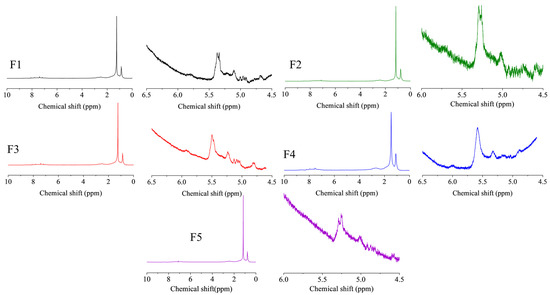 The 1H-NMR spectra of FCC slurry oil before and after hydrotreatment. The feed FCC slurry oil is designated as F1; FCC after reaction with non-catalyst is designated as F2. FCC after reaction with A-MoS2 is designated as F3; FCC after reaction with M-MoS2 is designated as F4; FCC after reaction with Mo2C is designated as F5.