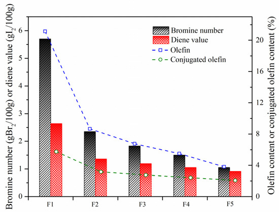 In order to further investigate olefin removal with the aid of these nanoparticles, the bromine number and diene value were measured. As shown in Figure 10, the catalytic activity of W-MoS2, O-MoS2 and Mo2C to remove olefins was improved successively, which was consistent with the observation with the model compound. With Mo2C, the olefins had significantly decreased from 5.7 to 1.05 gBr2/100 g, and the conjugated olefins were reduced from 2.64 to 0.91 gI2/100 g. Based on the formulation as Equations (1) and (2), the content of olefins can be calculated.