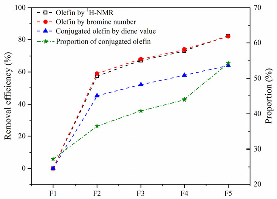 Removal efficiency of olefins in the SLO. The feed FCC slurry oil is designated as F1; FCC after reaction with non-catalyst is designated as F2. FCC after reaction with A-MoS2 is designated as F3; FCC after reaction with M-MoS2 is designated as F4; FCC after reaction with Mo2C is designated as F5.