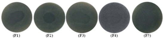 To describe the thermal stability of slurry oil, the spot experiment was carried out, with the results displayed in Figure 12. F1 shows obvious dark rings inside the spot indicating the poor stability of the feed oil, which can be mainly attributed to the existence of abundant active olefins. Therefore, the olefinic bonds must be hydrogenated to be removed. Mild hydrogenation treatment alone or with W-MoS2 were not so effective in improving the stability of SLO. In contrast, when O-MoS2 catalysts were added into the reaction system, the stability of the slurry oil was obviously improved, which was attributed to the good dispersion and strong catalytic hydrogenation activity of MoS2. Additionally, the spot experiment of slurry oil under Mo2C showed that almost no dark rings appeared, implying high hydrogenation activity of the Mo2C catalyst which effectively enhanced the thermal stability of SLO.