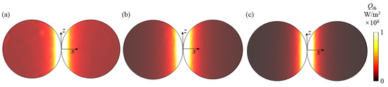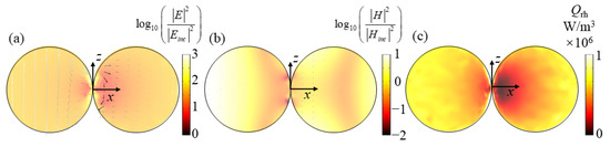 Next, we analyze the resonance modes of all absorption peaks in Figure 2a through the obtained electromagnetic field. Figure 3a,b show the electric and magnetic fields at the absorption peak λ = 410 nm when the dimer is at x-incidence with z-polarization, respectively. It can be seen from Figure 3a that the electric field at the corner of the combination of the two spheres nanoparticle in the dimer is significantly enhanced, and the electric field intensity is approximately symmetrically distributed along the x-axis. For the magnetic field in Figure 3b, the magnetic fields in the leftmost and rightmost parts and the middle right part of the dimer are enhanced. The electric vector direction is consistent with the direction of the incident electric field and conforms to the characteristics of electric resonance [49]. The enhanced electric field is attributed to the LSPR effect, which has been verified to be able to occur in the nanogaps between closely located metallic nanoparticles [50,51]. This LSPR phenomenon can be understood as the coupling and hybrid of the plasmons induced by single nanoparticles in the dimer. Figure 3c shows the resistance heat distribution at the resonance peak. It can be seen that the LSPR at the junction not only increases the electric field but also enhances the resistance heat distribution. These heat losses will then enter the surrounding liquid from the particles to realize the conversion of the electromagnetic energy of sunlight to the thermal energy in the liquid, thereby improving the energy conversion efficiency of the specific photothermal effect.