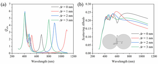 In the process of synthesis, two spheres may deviate from being completely tangent and embedded. Figure 7 presents the effect when the two spheres are embedded. As can be seen from Figure 7a, the first absorption peak hardly changes, which is caused by the main LSPR around the sphere. Without considering Δr = 0, with the increase in Δr, the second and third absorption peaks are blueshifted, which is caused by the gap resonance between the two spheres as the gap decreases with the increase in the embedding depth Δr [35]. However, compared with Δr = 0, the second absorption peak is blueshifted or redshifted after the embedding between the two spheres, and all of the third absorption peaks are redshifted. Figure 7b shows the scattering albedo of the dimer with different embedding depth. With the increase in embedding depth, the intensity of the scattering albedo does not significantly change. In conclusion, the embedding produced in the synthesis process has a favorable effect on the absorption efficiency of the plasma dimer, and the occurrence of embedding will lead to redshifted or blueshifted, which will further improve the absorption of solar energy.