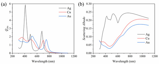 In addition, the material of nanoparticles can also have an important impact on their optical properties. Therefore, we investigate the absorption efficiency and scattering albedo of the plasma dimers based on several common materials (i.e., Cu and Au). The absorption efficiency of the dimer nanoparticle with different metal materials is shown in Figure 8a. Clearly, the materials of the plasma dimer nanoparticle have a great influence on the absorption efficiency. The absorption efficiency of the Ag dimer is described above. For the Cu dimer nanoparticle, there are three absorption peaks at the wavelengths of 350 nm, 500 nm and 700 nm. For the Au dimer nanoparticle, a main peak with an absorption efficiency of 2.1 appears at the wavelength of 520 nm, and another peak occurs at around 750 nm. Figure 8b compares the scattering albedo of the dimer with the three different materials. It can be clearly seen that with the increase in wavelength, the scattering of the Ag dimer nanoparticle at first increases rapidly and then remains at a relatively large value. While the scattering of the Cu dimer nanoparticle drops down at first and then increases gradually and reaches 0.2. For the Au dimer nanoparticle, the trend of the scattering is similar to that of the Cu dimer nanoparticle, but the scattering of the Cu dimer is higher. In summary, adjusting the combination of different metal nanoparticles to adjust the energy window required for solar energy absorption has the potential to improve solar energy absorption and requires further development.