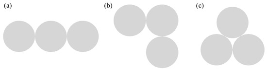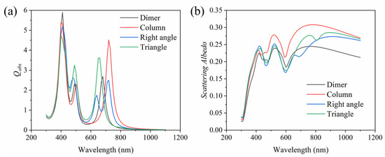 In addition, we studied the synthesis of plasma trimers by three Ag spheres. Figure 9a–c are schematic diagrams of the column structure, right angle structure and triangle structure synthesized by three Ag spheres, respectively. Figure 10 compares the absorption efficiency and scattering albedo (average value of the three directions) between the dimer and these three special structure trimers. It can be clearly seen from Figure 10a that the absorption efficiency of trimers with different structures is different. Similarly, the three structures have an absorption peak near 400 nm, but they are all lower than the absorption peak of the dimer. Moreover, it is found that three absorption peaks occur at the wavelength of 400 nm, 500 nm and 720 nm for the column structure, and the absorption efficiency is 5.4, 2.3 and 4.5, respectively. The absorption peaks of the triangle structure are around 400 nm, 490 nm and 660 nm, and the ratio of absorption efficiency is 4.7, 3.3 and 3.6, respectively. The right angle structure trimer has four absorption peaks, and the main peak with an absorption efficiency of 5.2 is located near 410 nm. The other three absorption peaks are located near 480 nm, 640 nm and 720 nm, and the absorption efficiency fractions are 2.6, 1.7 and 2.5, respectively. Compared with the dimer, the column and triangle structure trimers have higher absorption peaks except for the main peak. The right angle structure trimer has one more absorption peak than the dimer, which is more favorable for the absorption of solar energy. Moreover, compared with the dimer, the trimer can better enhance the absorption at the resonant wavelength. This is because all of the gaps of the trimer have strong resonances, and the resonances at the gaps are superimposed on each other, resulting in an enhanced electric field of the entire particle area. Figure 10b shows the comparison of the scattering albedo of the dimer and the three different structures. The scattering of the trimer is slightly larger than that of the dimer on the whole. Moreover, the overall scattering of the column structure is relatively stronger, while the scattering albedo of the right angle and triangle structures is very similar.