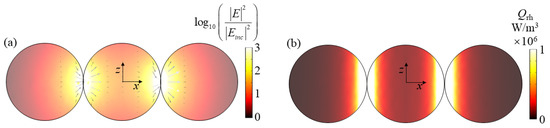 Figure 11 shows the electric field and resistive heat distributions of the plasma trimer (column structure) at the wavelength of 720 nm when the applied plane wave is z-incidence with x-polarization. As shown in Figure 11a, it is clear that due to the strong resonance at the gap, the electric field strength at the Ag ball joint is greatly increased. The direction of the electric vector is consistent in the direction of polarization, which indicates the properties of LSPR. Moreover, the enhancement of electric field intensity is concentrated at the junction. In summary, this electric resonance mode is still considered LSPR. In addition, as shown in Figure 11b, due to LSPR, the resistive heat distribution at the junction of the Ag balls is greatly enhanced.