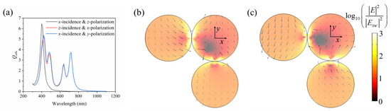 (a) Absorption efficiency in three directions of a right-angled trimer and the electric field of (b) z-incidence with x-polarization and (c) x-incidence with y-polarization at λ = 420 nm.