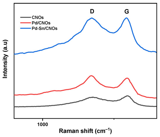 The Raman spectra of carbon nano-onions (CNOs), Pd/CNOs, and Pd-Sn/CNOs are depicted in Figure 1. As expected for carbonaceous materials, all Raman spectra display two prominent peaks which correspond to D and G bands. The disordered carbon peak, caused by C–C vibrations and associated with the disruption of the sp2 hybridized carbon bonds, is responsible for the observed D-band. Dangling bonds, sp3 bonding, vacancies, and other carbon rings resulting from structural rearrangement all contribute to this [23,24]. The emergence of the shoulder around 1000 cm−1 is due to the existence of more sp3 hybridized carbons close to those found in the diamond-like amorphous material [24,25]. The G-band indicates a graphite peak. The in-plane vibration modes of the sp2 carbon bonds are attributed to the presence of this peak, which represents the order of graphitic carbons in the structural matrix of CNOs [26]. The ratio of the relative intensity of the D-band to that of the G-band (ID/IG) is used to quantify the degree of graphitization of CNOs produced. The degree of disorder in the form of sp3 hybridized carbons and the presence of shorter graphitic fragments are directly linked to the disorder density ratio. The ID/IG value of CNOs is 0.85, denoting a high degree of graphitization within the CNO matrix. Meanwhile, the ratios of the Pd/CNO and Pd-Sn/CNO electro-catalysts were found to be 0.96 and 0.99, respectively. The higher ID/IG values of the electro-catalysts compared to those of the CNO supports indicate that the incorporation of Pd and Sn into the CNOs caused defects in the CNO structure and lattice symmetry [27].