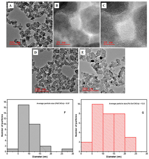 HR-TEM images of carbon nano-onion supports with different magnifications (A–C), Pd/CNO electro-catalysts, (D) and Pd-Sn/CNO electro-catalysts (E); average particle size of Pd NPs in Pd/CNOs (F) and Pd-Sn/CNOs (G).