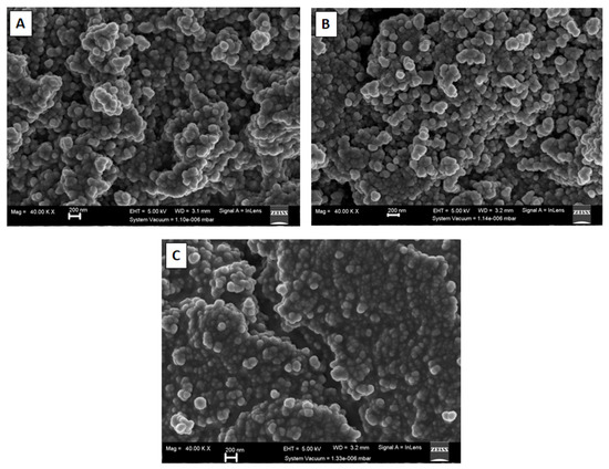 FESEM images of carbon nano-onion supports (A), Pd/CNO electro-catalysts (B), and Pd-Sn/CNOs electro-catalysts (C).