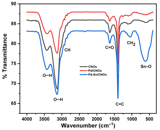 The existence of functional groups in the prepared CNOs, Pd/CNOs, and Pd-Sn/CNOs was evaluated by FTIR analysis (Figure 4). The CNOs exhibit vibrational bands at 3143 cm−1 and 3445 cm−1, ascribed to the OH vibrational stretch of the carboxylic group on the surface. Generally, the OH peak between 3000 and 3500 cm−1 is a broad peak. However, in this case, the peak is split into two; this is associated with the presence of alcohol O–H groups and water on the CNO surface [30]. Vibrations at 2849 cm−1 and 1085 cm−1 correspond to the aliphatic –CH and –CH2 groups, respectively. The vibration at 1636 cm−1 represents the C=O carbonyl group. The vibration at 1403 cm−1 corresponds to C=C stretching due to aromatic rings or an alkene functional group. The presence of carboxylic and hydroxyl groups on the CNO surface is confirmed by these peaks. These functional groups are responsible for the high hydrophilicity and dispersibility of the as-synthesized sample. The FTIR spectra of the Pd/CNO and Pd-Sn/CNO electro-catalysts are consistent with the results observed on the CNO spectrum, with the same functional groups observed. The attachment of the metal nanoparticles is promoted by the oxygen-containing species on the CNO surface [31,32].