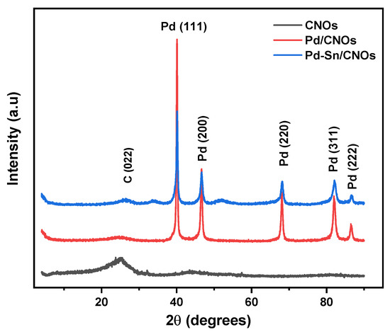 XRD was performed to evaluate the crystal structure and phase purity of the CNOs, Pd/CNOs, and Pd-Sn/CNOs. Figure 5 shows the XRD pattern of the CNOs, which depicts a prominent graphitic peak at 2θ = 25.5°, corresponding to graphitic plane (002) reflection. The broadness of the (002) peak could be due to the CNOs’ small particle size and the stacked graphitic layers’ short domain order [33]. The broad peak between 2θ = 40° and 50° corresponds to the (100) and (101) reflections of the graphitic planes [34]. The XRD pattern of Pd-CNO nanocomposite clearly shows the characteristic diffraction peaks of Pd (111), (200), (220), (311), and (222) lattice planes at 2θ = 40°, 48°, 68°, 84°, and 87°, respectively. The existence of these new peaks in the Pd/CNO nanocomposite indicates a successful introduction of Pd nanoparticles. The intensity of the graphitic plane (002) of CNOs is too low due to the high peak intensity Pd peaks [35]. The Pd-Sn/CNO electro-catalyst exhibits broader diffraction peaks, which are the characteristic crystalline faces of Pd. The observed broad peaks indicate a decrease in particle size and an increase in the lattice parameter of palladium. The slight shift in the diffraction peaks indicates the formation of an alloy, specifically the formation of a solid palladium-tin alloy. The average particle size of Pd in the Pd-Sn-CNOs electro-catalyst was found to be 1.14 nm; this is almost half the particle size of Pd in the Pd/CNO electro-catalyst (2.32 nm). The lattice parameter of Pd in the Pd-Sn/CNOs was found to be 0.4876 nm; this is higher than that of Pd in the Pd/CNO electro-catalyst (0.3598 nm) due to the alloying of palladium with tin.