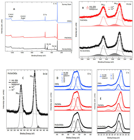 Figure 6B reports the Pd 3d XPS spectra for the Pd/CNOs and Pd-Sn/CNOs. Both spectra are composed of two main peaks ascribed to Pd 3d5/2 and 3d3/2 spin-orbit components, as labelled in the figure. The best fit to the experimental data was obtained by adding two spin-orbit doublets (both separated by a spin-orbit splitting of 5.3 eV, as per the relevant literature) and a Shirley-type background. The binding energy of these two components makes it possible to ascribe them to Pd0+ and Pd2+ oxidation states, which are appended to the figure [37]. The fit results with regards to binding energy (BE) and spectral weight of the components are reported in Table 1.