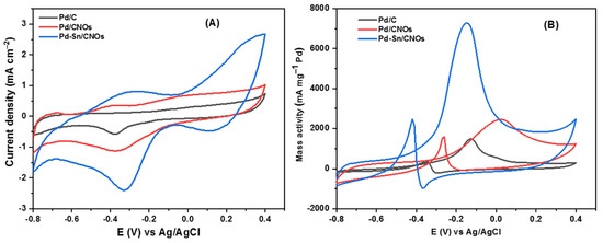 Figure 7A presents the CV curves of Pd/C, Pd/CNO, and Pd-Sn/CNO electro-catalysts on the GC electrode in 1 M KOH for the determination of electrochemical active surface area (EASA). In all CV curves, an OH- adsorption peak was observed from −0.8 V to 0.4 V and a PdO reduction peak was observed from 0.4 V to −0.8 V. At lower potentials, the Pd-Sn/CNO electro-catalysts possess the highest oxygenated species reduction, facilitating alcohol oxidation [46]. The electrochemically active surface areas (EASA) of the electro-catalysts were calculated using these CV curves (Pd/C, Pd/CNOs, and Pd-Sn/CNOs) and the electro-catalysts’ EASA was determined using the following formula [47]: