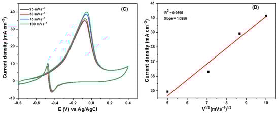 Figure 9B presents the cyclic voltammogram of the Pd-Sn/CNO electro-catalyst at various scan rates from 25 to 100 mVs−1. To evaluate the electrochemical processes occurring at the modified glassy carbon electrode, the effect of scan rate on current density was investigated (adsorption or diffusion). As expected, the anodic peak current density is directly proportional to the square root of the scan rate. As the peak current density increases with the scan rate, the peak potential is drifting to more extreme potentials. The development of poisonous intermediates during the oxidation of ethanol may be linked to this change in potentials [61]. Despite the fact that poisonous species slow down the catalytic activity of the electro-catalyst, the Pd-Sn/CNO electro-catalyst exhibited a higher current density and stability in contrast to the other electro-catalysts. To better understand the processes occurring at the electrode surface, the peak current of each scan rate was plotted against the square root of the scan rate. The plot of the Pd-Sn/CNO electro-catalyst in Figure 9C does not have a perfect linear fit graph. This is mainly caused by electron transfer reactions occurring between the electrode and adsorbed molecules on the glassy carbon electrode during ethanol oxidation [62].