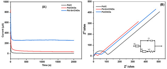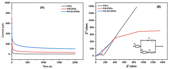 Chronoamperograms (A) and Nyquist plots with corresponding equivalent circuit (B) of Pd/C, Pd/CNO, and Pd-Sn/CNO electro-catalysts in 1 M KOH + 1 M CH3CH2OH solution.