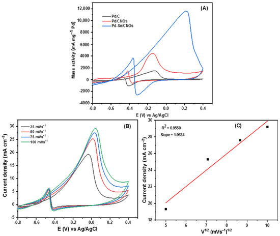 Two distinct forward and backward current peaks characterize alcohol oxidation reactions. The oxidation reaction is represented by the forward peak due to electro-oxidation of newly chemisorbed species resulting from adsorbed alcohol molecules. The elimination of intermediates that were only partially oxidized in the forward scan is represented by the backward peak. The catalytic activity for the electro-oxidation reactions of alcohol fuels is measured by the size of the forward peak [48,49,50]. As shown in Figure 7B, it is evident that electro-catalytic activity for methanol oxidation on the Pd-Sn/CNO electro-catalyst is greater than that of the Pd/CNO and Pd/C electro-catalysts. This may be due to the high surface area and higher palladium utilization provided by the support material, faster methanol adsorption, and availability of oxygen-containing species (OH−) in alkaline medium and provided by PdSn alloy. In an alkaline medium, the backward peak is smaller than the forward peak. This is because, in an alkaline medium, the removal of adsorbed carbonaceous species is easier due to the availability of oxygen-containing species (hydroxyl and carbonyl carbon), which allow faster methanol oxidation [51].