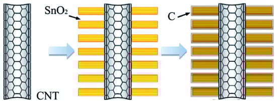 Schematic illustration of the formation of the branched MWCNT@SnO2 nanorod@carbon heterostructures. Used with permission of The Royal Society of Chemistry from [44], Copyright© 2013; permission conveyed through Copyright Clearance Center, Inc.