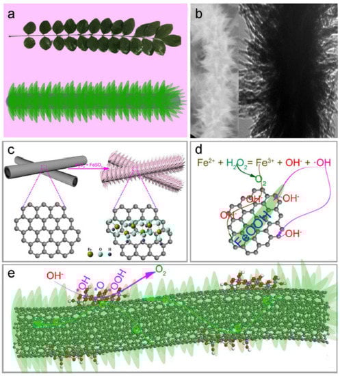 (a) Model of a leaf–branch structure; (b) electrocatalyst with a leaf–branch structure; (c) the leaf–branch synthesis process, and (d) reaction mechanism of the electrocatalyst. (e) Schematic of FeOOH@CNTs electrocatalysis process. Reprinted from [87], Copyright© 2019, with permission from Elsevier.