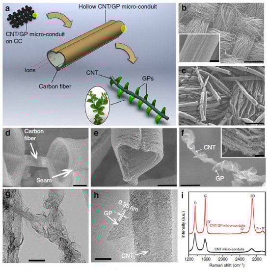 Structural characterization of CNT/GP micro-conduits. (a) Schematic illustration of CNT/GP micro-conduits in a leaves-on-branchlet nanostructure on CC substrates for high-performance supercapacitor electrodes (note that the yellow shaded areas in the schematic indicate the selected areas to be magnified). (b) Bare CC substrate at low magnification (inset shows the surface of a single carbon fiber). (c) Uniform coverage of CNT micro-conduits on carbon fibers at low magnification. (d) A close-up of CNT micro-conduits on a carbon microfiber. (e) A CNT/GP micro-conduit in a heart shape. (f) A single CNT decorated with many GPs at high magnification (inset shows GPs on CNT micro-conduit array walls). (g) TEM image of the hierarchical structure. (h) HR-TEM image of a petal emerging from a nanotube. (i) Comparative Raman spectra of CNT micro-conduits and CNT/GP micro-conduits on CC substrates. Scale bars: (b) 500 μm (inset: 3 μm), (c) 300 μm, (d) 10 μm, (e) 20 μm, (f) 300 nm (inset: 2 μm), (g) 100 nm, (h) 10 nm. Reproduced from [99] under a Creative Commons license http://creativecommons.org/licenses/by/4.0/ (accessed on 7 October 2021).